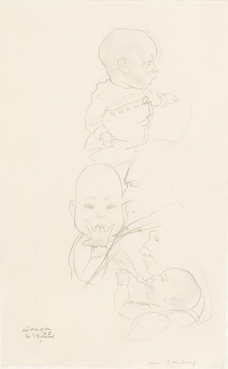 Drie studies van een baby: Boven: Ter halver lijve zittend en profil naar rechts, midden: Ter halver lijve met het hoofd frontaal, twee vingers in de mond, zittend op de arm van de vader (die schetsmatig is aangegeven), onder: Borststuk liggend en profil naar links, drinkend uit de fles, in de armen van de vader (die schetsmatig is aangegeven).