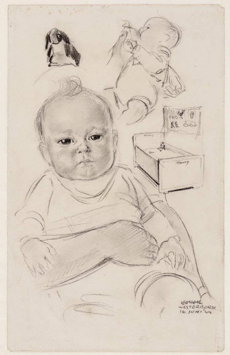 Twee studies van een baby: Boven: Kniestuk liggend in de armen van zijn/haar moeder en trois quart naar links, drinkend aan de borst. Onder: Kniestuk zittend frontaal in de armen van een ouder. L.b. een speelgoedkonijn, m.r een kinderledikantje met de naam 'Monny'.