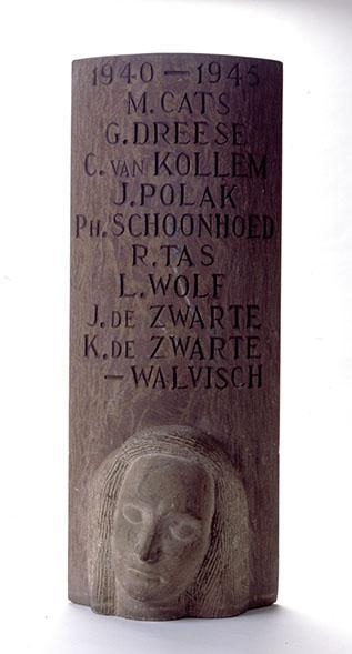 Ellipsvormige zuil met namen, waartegen aan de onderzijde voor, een gebeeldhouwd vrouwenhoofd, en trois quart naar links, is geplaatst.