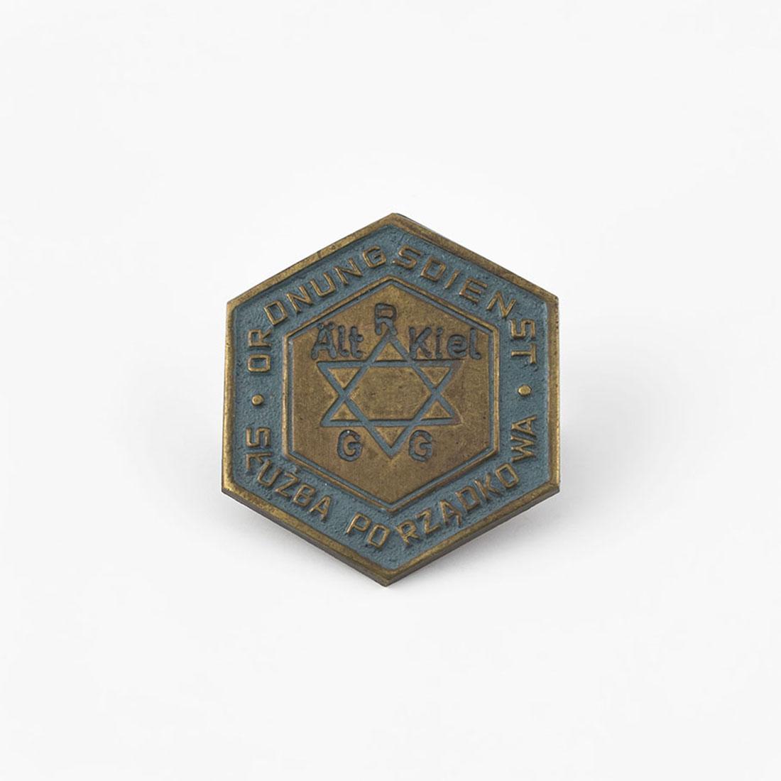 Zeskantige messing broche met rondschrift op blauwe achtergrond en veld met blauwe davidster.