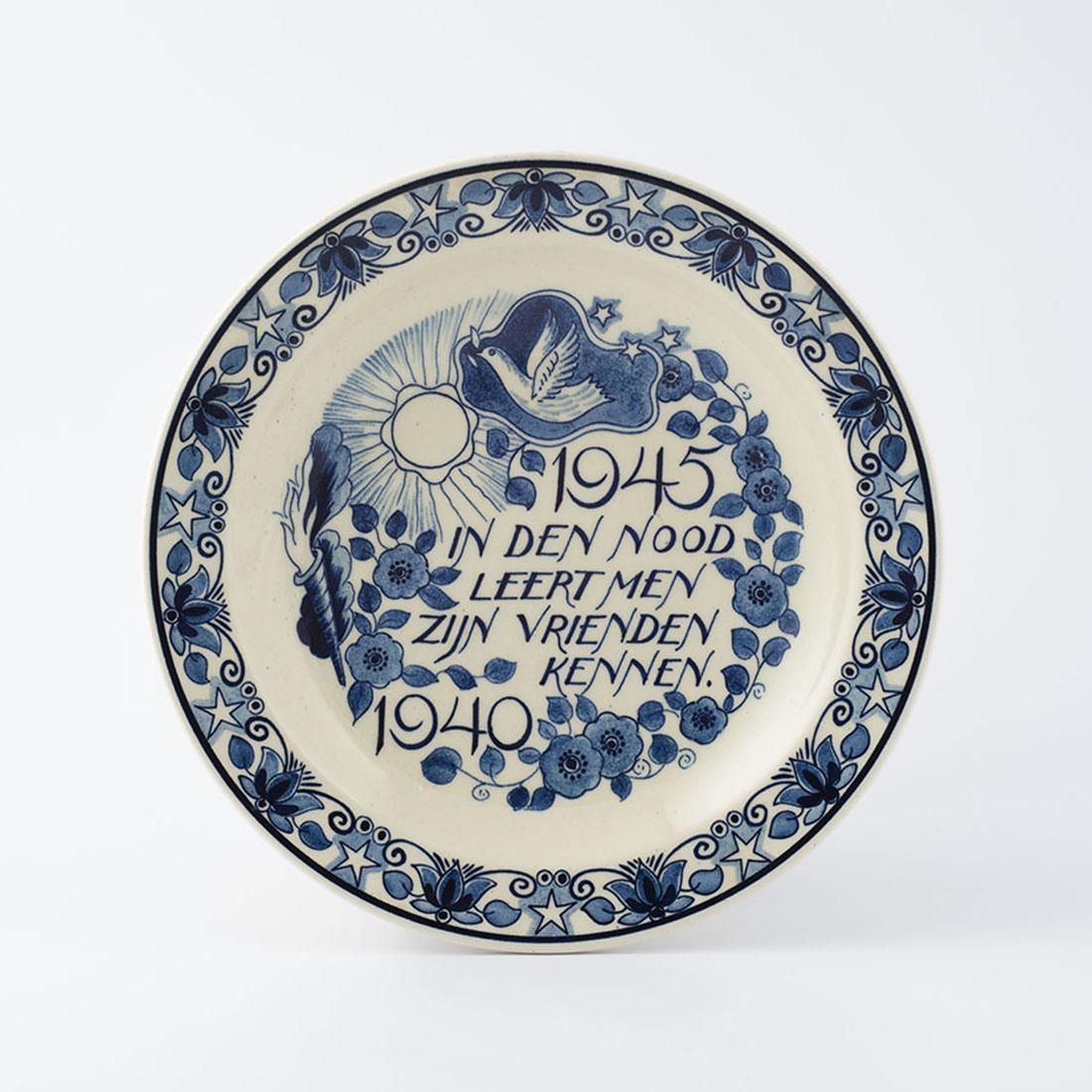 Loodgeglazuurd diep bord met crèmekleurig fond en blauwe decoratie . In de spiegel is een opschrift aangebracht.