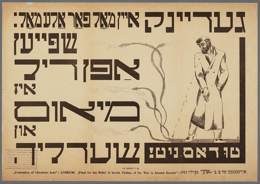 Hebreeuwse opschriften met rechts een man met pet die op de grond spuwt, waaruit slangvormige ziektekiemen opstijgen