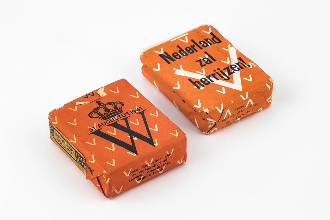 Oranje sigarettenverpakking inclusief sigaretten. Met over gehele verpakking witte " V " en aan de voorzijde een blauwe kroon. Blauwkleurige opdruk.