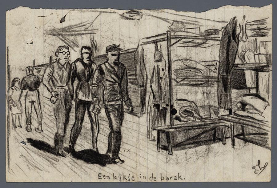 Interieur barak met aan de linkerzijde stapelbedden, rechts daarvan lopende mensen.
