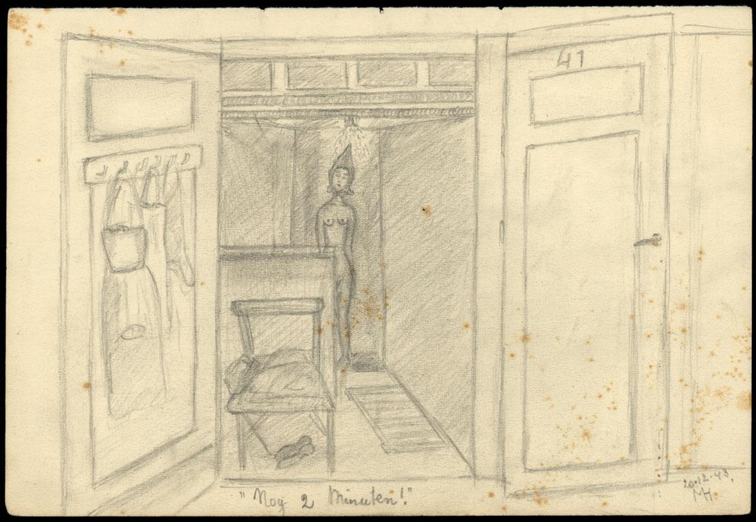 naakte vrouw in douche in kamp Westerbork, de deuren staan open, links hangen kleren. douchehok nummer 41.