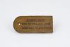 Houten labeltje met naam en data, rechthoekig en aan een uiteinde halfrond, met een gaatje voor bevestiging.