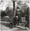 Doodgraver met hoge hoed, zittend op de rand van de laadbak van een bakfiets.