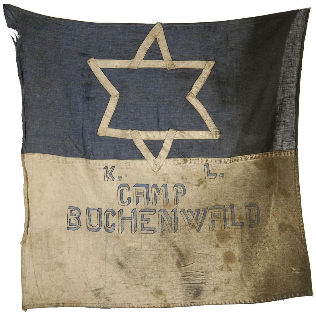 Tentoonstellingstekst Nationaal Holocaustmuseum, maart 2024 Vlag Ongeveer 250 Joden uit Nederland zijn vermoord in Buchenwald. Op 11 april 1945 werd het kamp bevrijd door het Amerikaanse leger. De gevangenen hesen toen deze vlag.