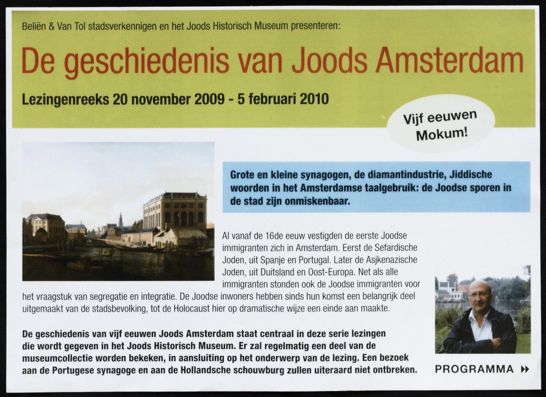 Affiche in kleur bij een lezingenreeks van 20 november 2009 tot 5 februari 2010 over de geschiedenis van Joods Amsterdam. Met kleurenfoto van zicht op het Joods Historsich Museum en de Portugese synagoge