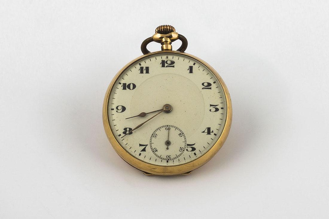 Gouden zakhorloge met een uitklapbaar deksel aan de achterzijde. Op de witte wijzerplaat is een aparte kleinere wijzerplaat met secondenwijzer aangebracht.