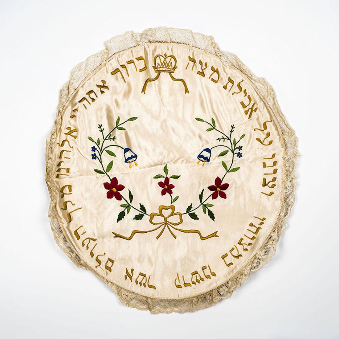 Matzekleedje van zijde met een met kant afgewerkte rand, vervaardigd tussen 1930 en 1940. Het ovalen kleedje heeft bloemtakken als decoratie, door een strik verbonden, met een kroon en in het Hebreeuws de zegenspreuk voor het eten van de matsa op de hagada (sederavondviering). Het kleedje voor het op tafel afdekken van de matzes heeft aan de onderzijde vier aan elkaar genaaide lagen stof. Hierdoor worden drie vakken gevormd voor de matzes die deel uitmaken van de hagada en die aan de binnenzijde zijn geborduurd zijn met de daarbij behorende aanduidingen Cohen, Levi en Israël. Dit matzekleedje was eigendom van de familie Sack uit Den Haag. Alle leden van het gezin zijn in de oorlog afgevoerd en vermoord. Volgens de schenkster - die boven de familie woonde - zijn diverse eigendommen in bewaring gegeven aan de buren. Na de oorlog is een bestek door familie van het gezin Sack opgehaald, maar dit matzekleedje kwam pas later tevoorschijn en is in 2013 aan het museum geschonken.