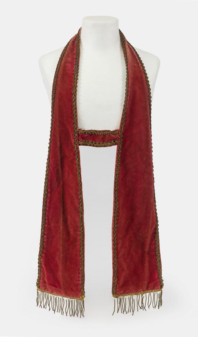 Stola, onderdeel van een sinterklaasuitrusting van gevoerd rood fluweel. De stola is aan de randen versierd met gouddraad en aan één kant verzwaard