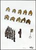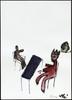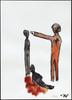 Een in een naïeve gestileerde stijl geschilderde aquarel voorstellende een man die zijn geweer op een andere man gericht houdt. Tussen hen in een vlaggestok met vlag.