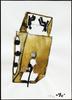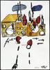 Een in een naïeve gestileerde stijl geschilderde aquarel met als voorstelling pijlen, een tent (?).