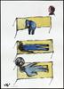 Een in een naïeve gestileerde stijl geschilderde aquarel voorstellende een man met vier vogels. Een van de vier vogels zit op zijn hand.