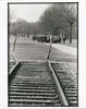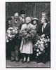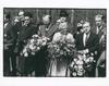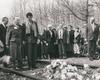 Prinses Juliana - op de rug gezien - in gesprek met een rabbijn. Diverse mensen kijken toe.