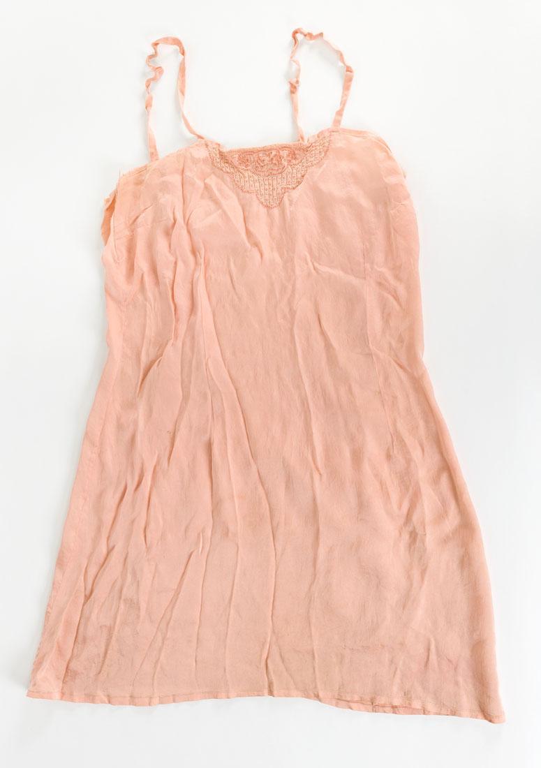 Roze onderjurk met smalle schouderbandjes en een geborduurde versiering met bloemmotieven onder de hals.