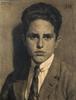 Portret van een jonge man met zwart haar, stropdas en jasje, borststuk en face.