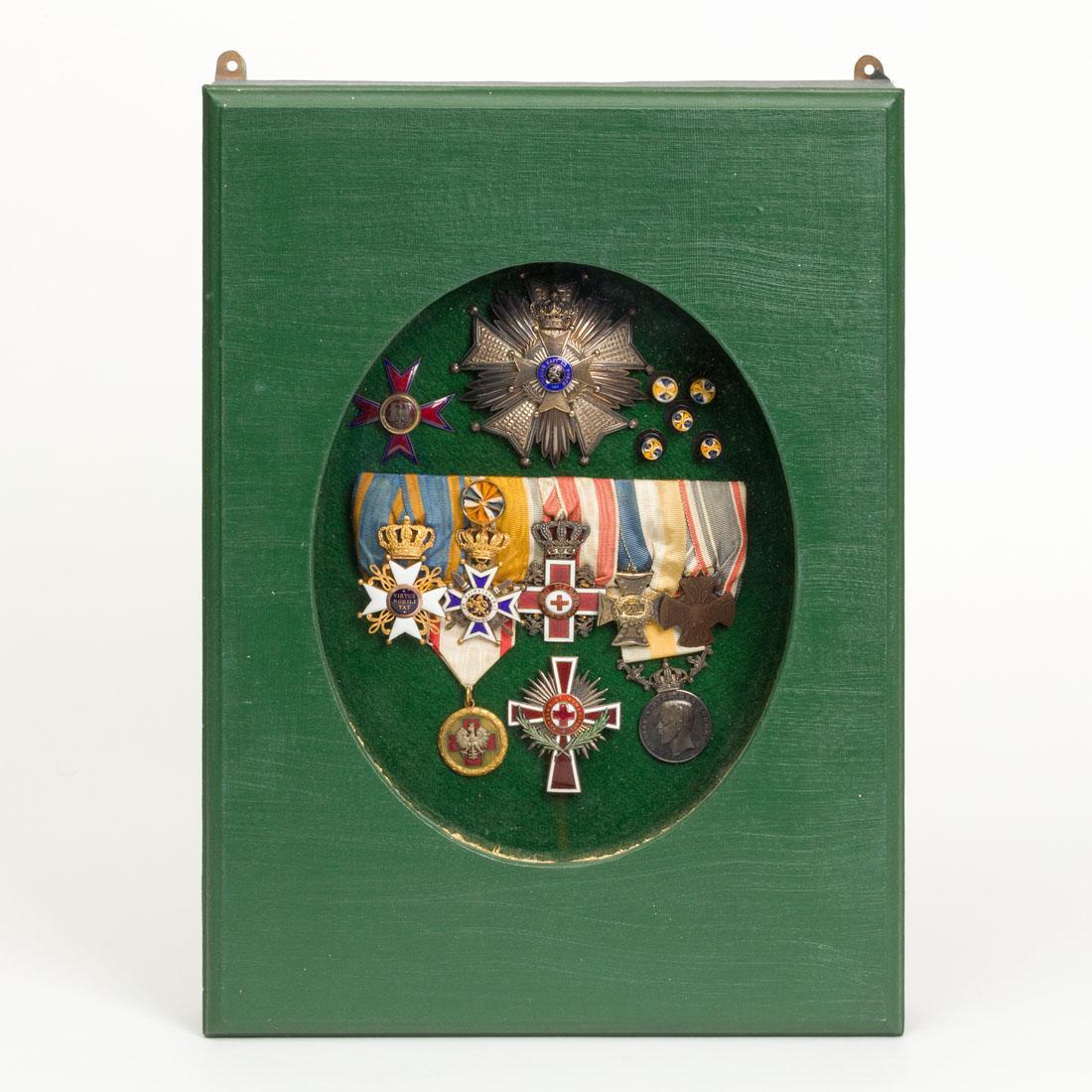 Doos met ovaal kijkglas waarachter 10 ordetekens (waaronder Orde van Oranje Nassau, Orde van de Nederlandse Leeuw, Officierskruis en Kruis van Verdienste van het Nederlandse Rode Kruis) en 5 reversknoopjes.