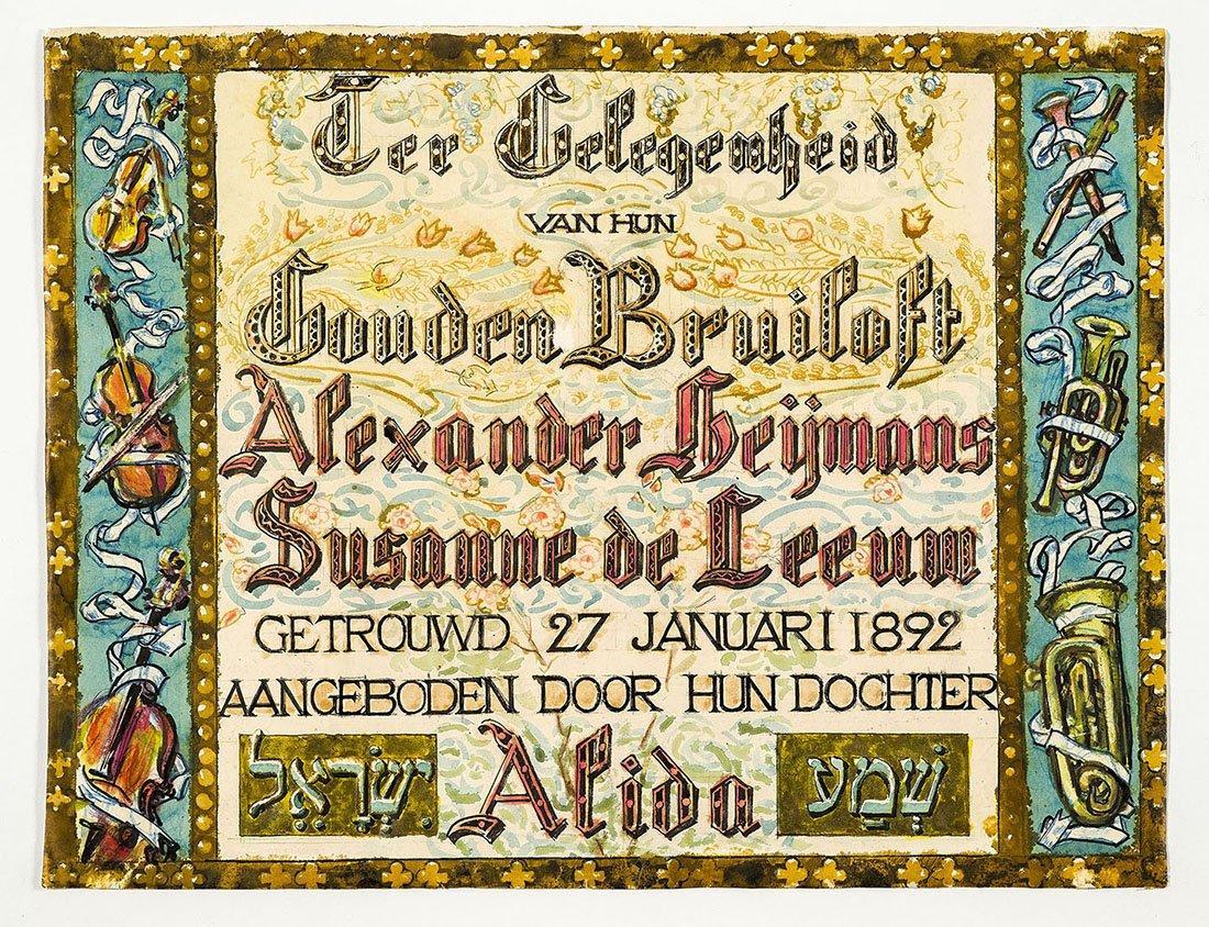 Alida Heijmans, altvioliste in het Concertgebouworkest vervaardigde deze oorkonde begin 1942 ter gelegenheid van het 50-jarig huwelijk van haar ouders Alexander Heijmans - tubaďst in het Concertgebouworkest van 1896 tot 1932 - en Suzanne Heijmans-de Leeuw. Alida en haar ouders overleefden de oorlog niet.