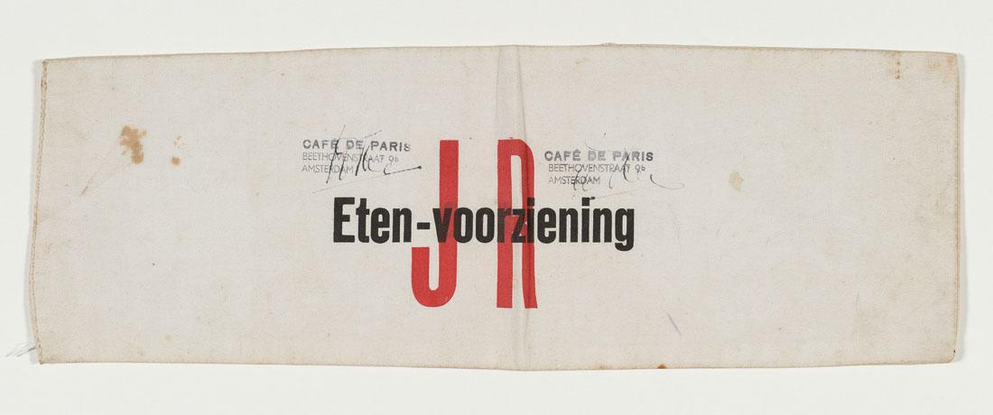 Mouwband ter identificatie van de werknemers bij de voedselverstrekking van de Joodse Raad. Deze mouwband behoorde toe aan Salomon Mandaat (1894-1965), werkzaam voor de etensverzorging in Café de Paris in de Beethovenstraat in Amsterdam.