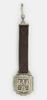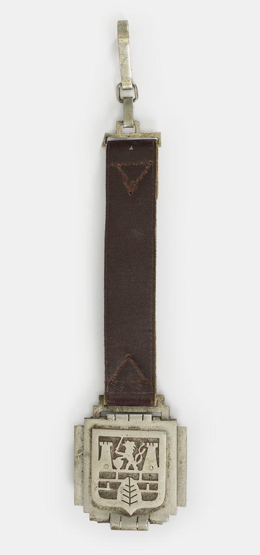 Bruinlederen band met hanger, gedecoreerd in metaal uitgevoerd wapen van Theresienstadt.