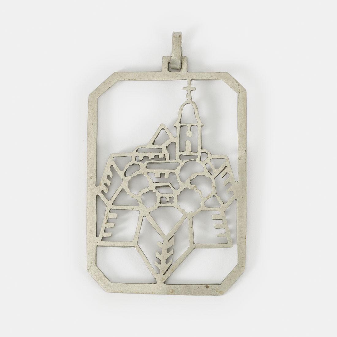 Witmetalen hanger met uitgezaagde afbeelding van landschap met kerktoren.