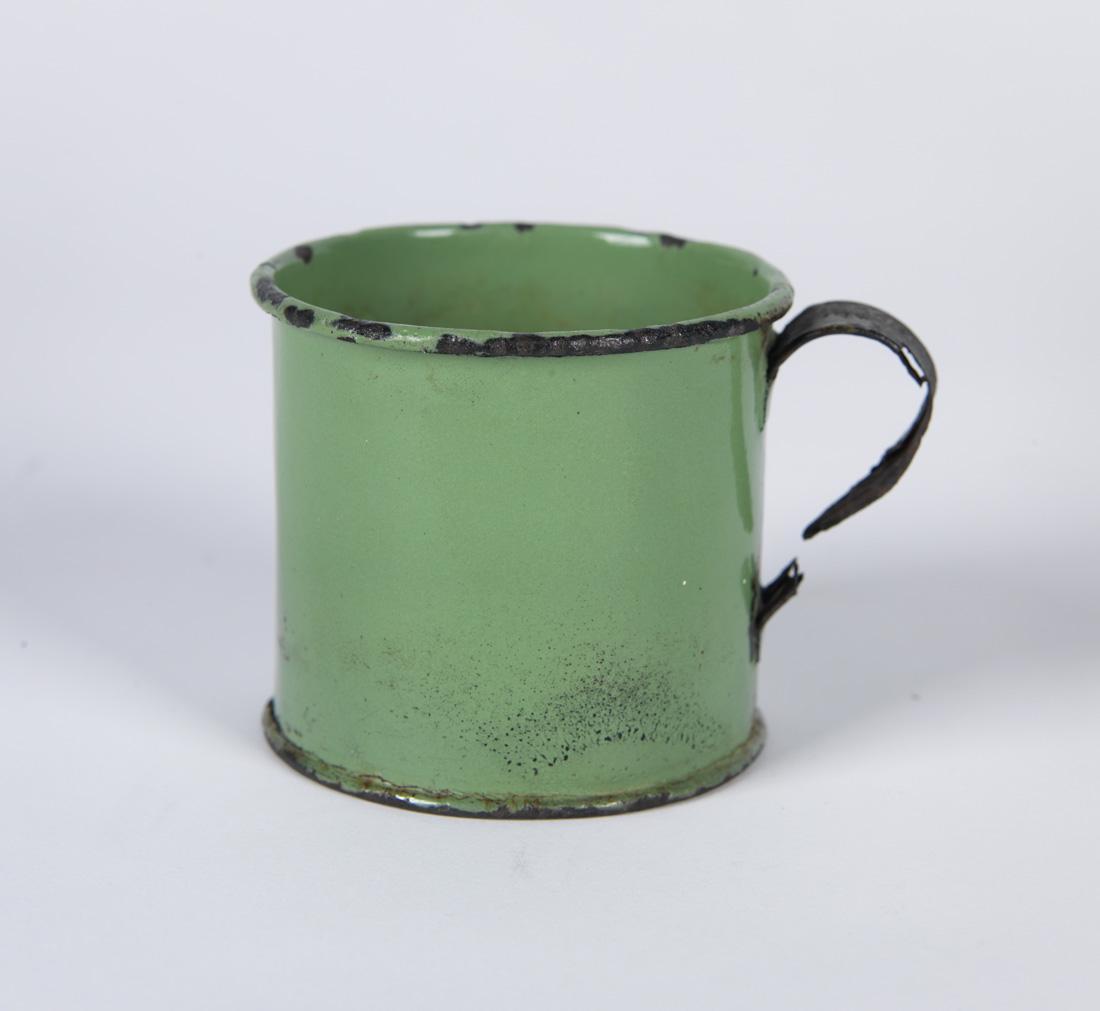 Tentoonstellingstekst Nationaal Holocaustmuseum, maart 2024 Rantsoen Bij het uitdelen van eten en drinken was het van levensbelang een eigen beker te hebben. Dit geëmailleerde exemplaar was van Elisabeth van Emden-Polk en haar man André. Toen zij uit Westerbork naar Bergen-Belsen werden gedeporteerd, namen zij de beker mee.