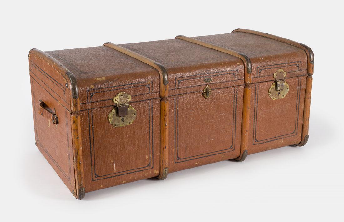 Hutkoffer bekleed met bruine jute en met houten banden en metaal verstevigd. Aan weerzijden een leren handvat. Gevoerd met gestreept katoen.