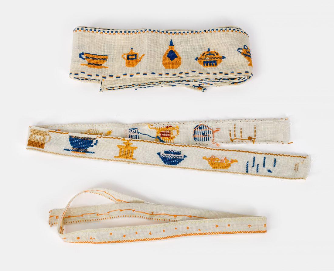 Zes smalle stroken katoen, versierd met geborduurde voorstellingen van huishoudelijk objecten zoals handkoffiemolens , theepotjes, kannetjes en ook een chanoekia. Ze zijn bedoeld als decoratie van (keuken)kastrandjes.