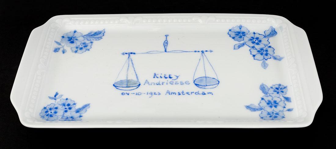 Rechthoekig porseleinen fabrieksbordje, later gedecoreerd met bloemen, een balans weegschaal en tekst.
