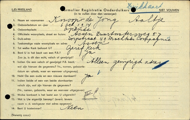 Duikadres: Dorpstraat 49, Drachtstercompagnie - Oorspronkelijk adres: Zwartwatersweg 57, Assen - Reden onderduik: anderszins - Overige opmerkingen: Bijzondere opmerkingen: reden onderduik: niet vermeld