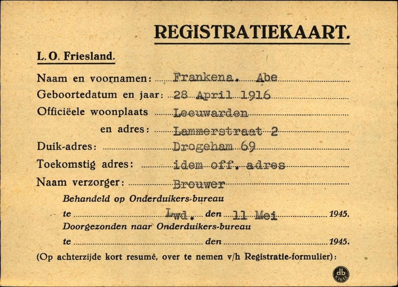 Duikadres: 69, Drogeham - Oorspronkelijk adres: Lammerstraat 2, Leeuwarden - Reden onderduik: arbeidsinzet - Overige opmerkingen: Achterkant bijzonderheden: Werkzaam geweest als controleur en chauffeur ondergedoken wegens AI - gewijzigd PB. alleen nwe. stkrt. met verkeerd Gemeentestempel - Achterkant beroep: controleur en chauffeur