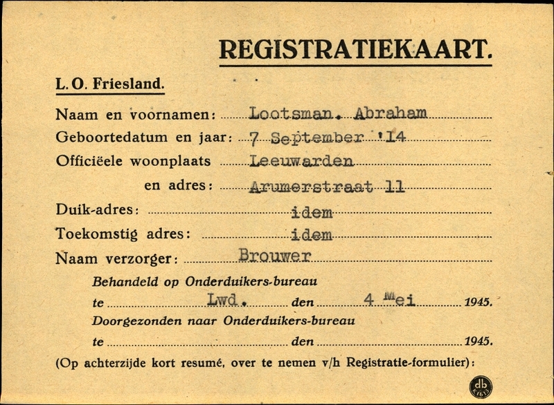 Duikadres: Arumerstraat 11, Leeuwarden - Oorspronkelijk adres: Arumerstraat 11, Leeuwarden - Reden onderduik: arbeidsinzet - Overige opmerkingen: Achterkant bijzonderheden: Beroep: glazenwasscher. - Ondergedoken wegens principieële redenen. A.I.? - Alleen nwe. stkrt. - Achterkant beroep: Glazenwasscher - Achterkant naam werkgever: -