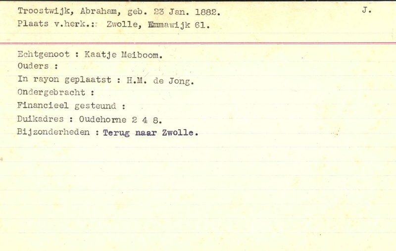 Duikadres: 248, Oudehorne - Oorspronkelijk adres: Emmawijk 61, Zwolle - Overige opmerkingen: Bijzonderheden: Terug naar Zwolle