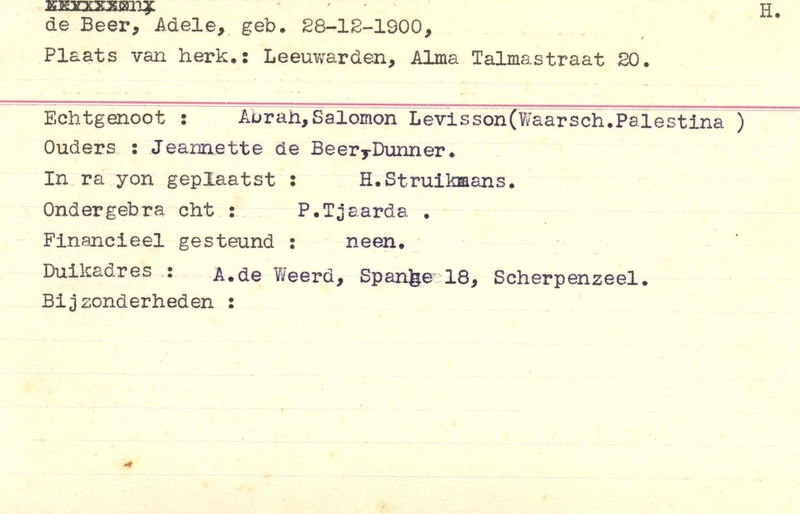 Duikadres: 18, Spanga - Oorspronkelijk adres: Alma Tademastraat 20, Leeuwarden - Overige opmerkingen: Bijzonderheden: bij echtgenoot is opmerking geplaatst - Abrah, Salomon Levisson (Waarsch. Palenstina) - Financieel gesteund: neen.