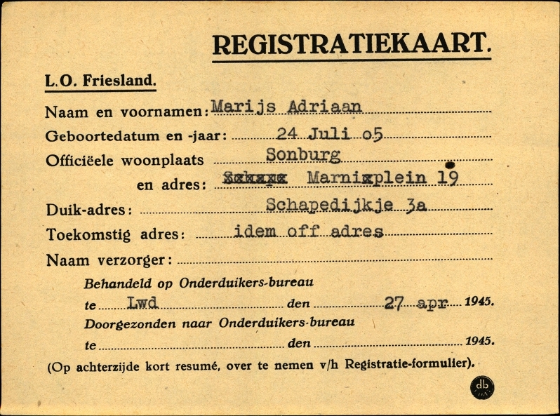 Onderduikinschrijving van Adriaan Marijs