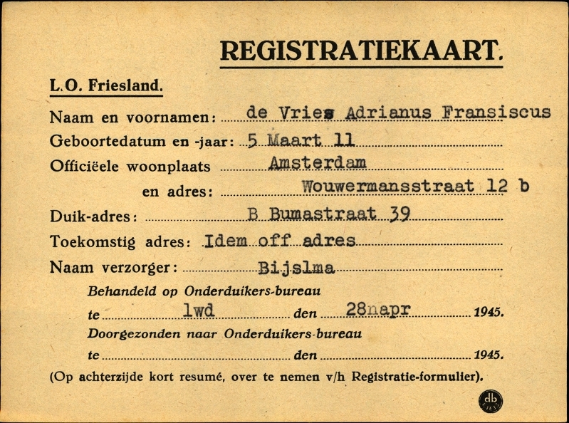 Onderduikinschrijving van Adrianus Fransiscus de Vries