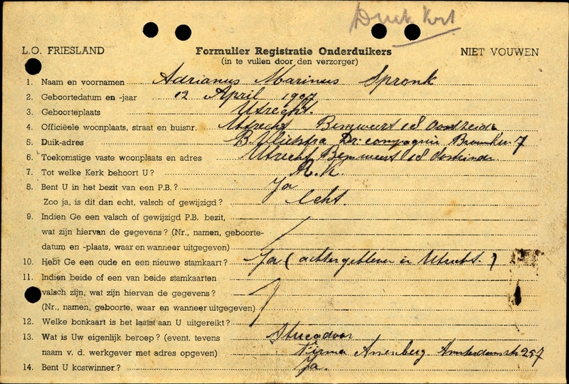 Onderduikinschrijving van Adrianus Marinus Spronk