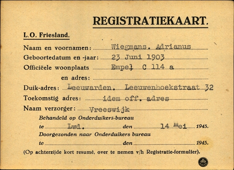 Duikadres: Van Leeuwenhoekstraat 32, Leeuwarden - Oorspronkelijk adres: C 114 a, Empel (Noord-Brabant) - Reden onderduik: arbeidsinzet - Overige opmerkingen: Achterkant bijzonderheden: geen nwe. stkrt. - Achterkant beroep: fabrieksarbeider