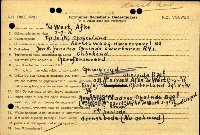 Duikadres: Swartfean RV1, Opeinde - Oorspronkelijk adres: Dwarsvaart 108 (Kortezwaag), Gorredijk - Reden onderduik: anderszins - Overige opmerkingen: Bijzondere opmerkingen: Reden onderduiken staat op kaart van de man. Vals P.B.: Opeinde B 79b. 037 N 014004 sinds 29-08-1941. Oude stamkaart No 18825; nieuwe No 020183. andere betrekking: gehuwd.
