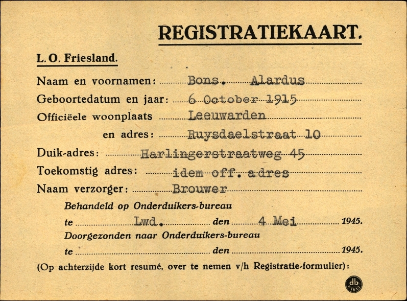 Duikadres: Harlingerstraatweg 45, Leeuwarden - Oorspronkelijk adres: Ruysdaelstraat 10, Leeuwarden - Reden onderduik: arbeidsinzet - Overige opmerkingen: Achterkant bijzonderheden: Toekomstig adres: idem off. adres - - Behandeld op Onderduikers-bureau te Lwd. den 4 Mei 1945. - Ondergedoken wegens A.I. en illgeaal werk - Achterkant beroep: chauffeur-monteur