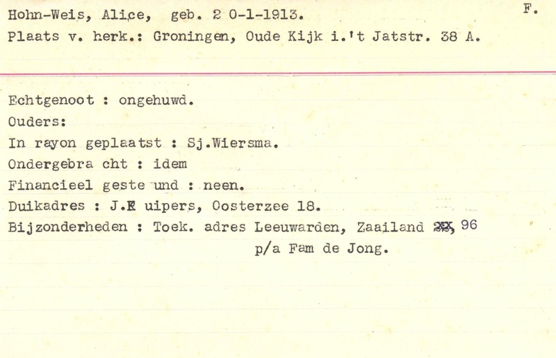 Duikadres: 18, Oosterzee - Oorspronkelijk adres: Oude Kijk in Het Jatstraat 38 A, Groningen - Overige opmerkingen: Bijzonderheden: Toek. adres Zaailand 96 Leeuwarden p/a Fam de Jong - Ongehuwd
