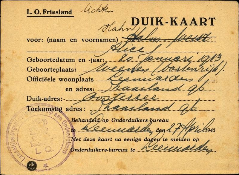 Duikadres: Oosterzee - Oorspronkelijk adres: Zaailand 96, Leeuwarden - Overige opmerkingen: Bijzondere opmerkingen: gehuwd met Hahn