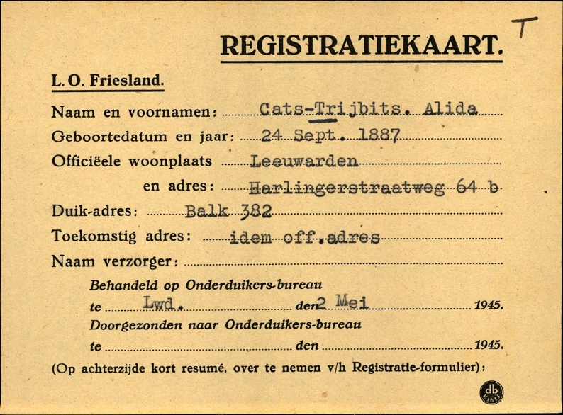 Duikadres: 382, Balk - Oorspronkelijk adres: Harlingerstraatweg 64 b, Leeuwarden - Reden onderduik: jodenvervolging - Overige opmerkingen: Achterkant bijzonderheden: Gehuwd met Cats. - Valsche nwe. stkrt. - Achterkant beroep: zonder beroep (huisvrouw)