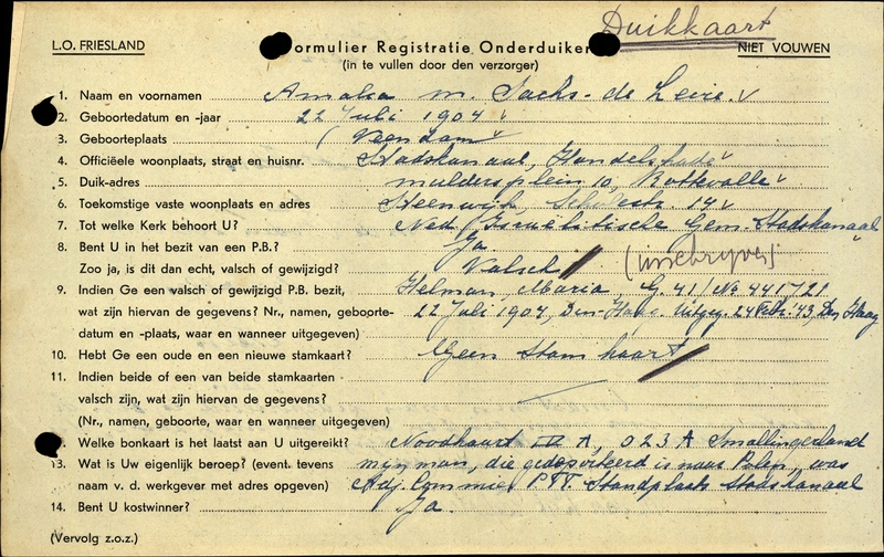 Duikadres: Muldersplein 10, Rottevalle - Oorspronkelijk adres: Handelskade, Stadskanaal - Reden onderduik: jodenvervolging - Overige opmerkingen: Bijzondere opmerkingen: Man van mw. Sachs - de Levie is gedeporteerd naar Polen. Mw. is kostwinner voor haar kind en die van haar zuster, die ook met haar man gedeporteerd zijn.