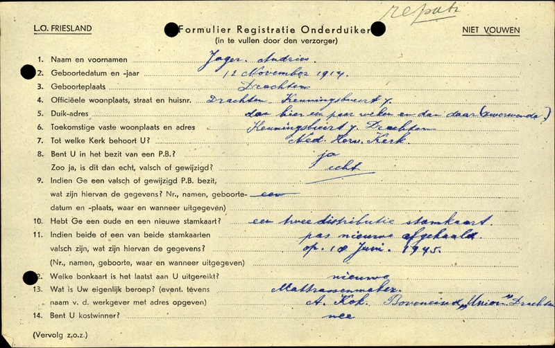 - Oorspronkelijk adres: Keuningsbuurt 7, Drachten - Reden onderduik: arbeidsinzet - Overige opmerkingen: Bijzondere opmerkingen: Heeft ondergedoken gezeten op verschillende, adressen. (zwervende)