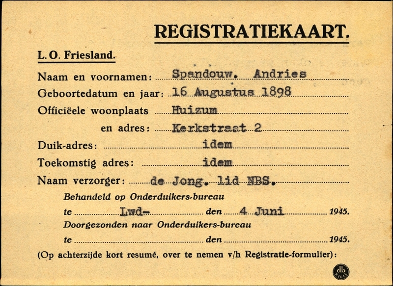 Duikadres: Kerkstraat 2, Huizum - Oorspronkelijk adres: Kerkstraat 2, Huizum - Reden onderduik: arbeidsinzet - Overige opmerkingen: Achterkant bijzonderheden: Verzorger de Jong lid van NBS. - Wel stkrt. - Achterkant beroep: vertegenwoordiger - Achterkant naam werkgever: -