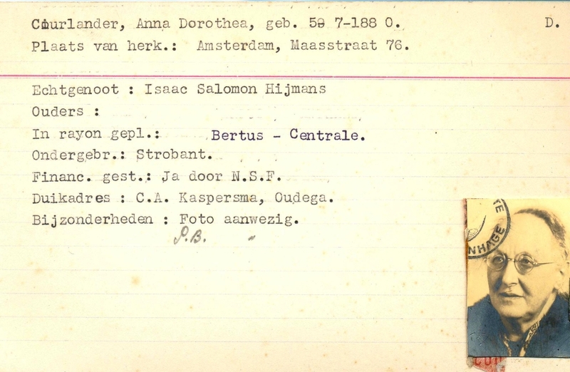 Duikadres: Oudega (Gem. Súdwest-Fryslân) - Oorspronkelijk adres: Maasstraat 76, Amsterdam - Overige opmerkingen: Bijzonderheden: Financ. gest.:Ja door N.S.F. - Foto aanwezig - P.B.aanwezig