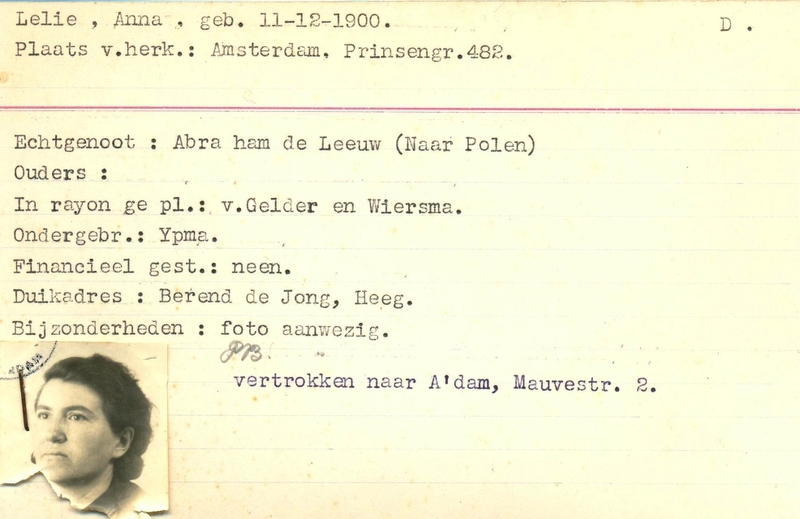 Duikadres: Heeg - Oorspronkelijk adres: Prinsengracht 482, Amsterdam - Overige opmerkingen: Bijzonderheden: Echtgenoot naar Polen. - Foto en PB aanwezig. - Vertrokken naar A'dam Mauvestr. 2